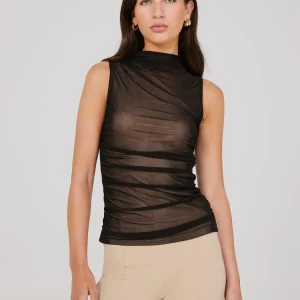 One-Shoulder Mock Neck Top With Mesh Overlay