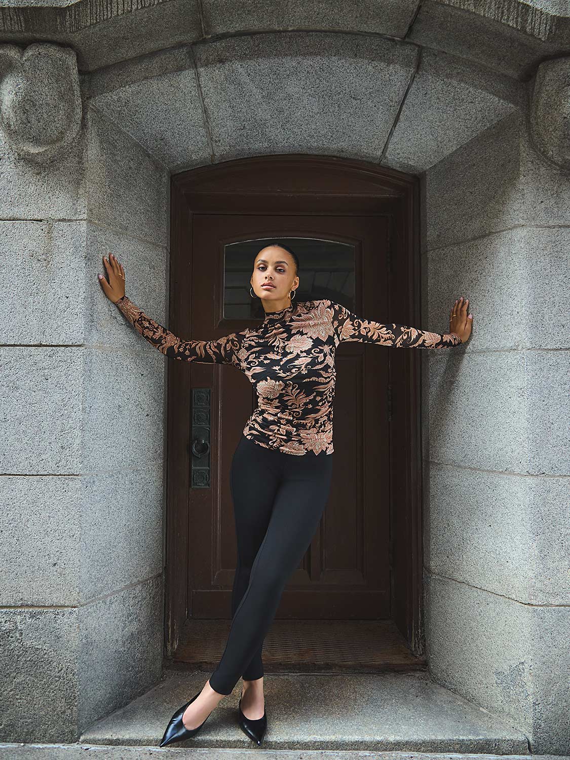 Dress to impress with this charming abstract print top that’s crafted from ruched mesh for a chic and textured look.