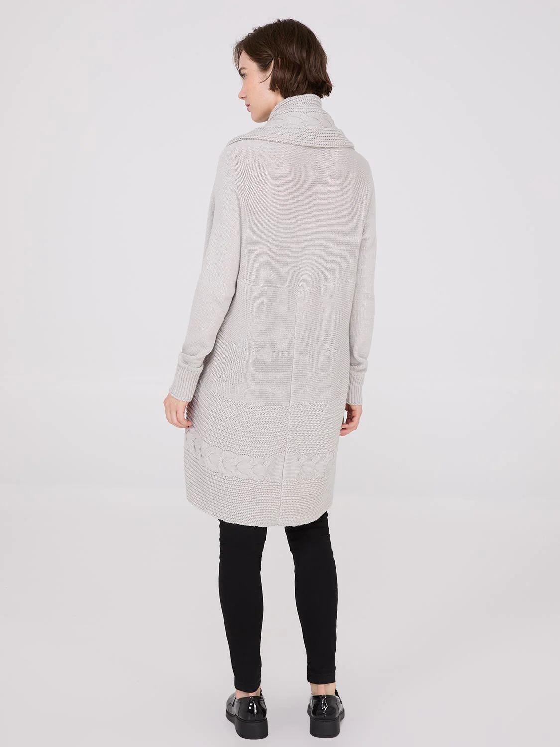 This warm and comfortable cocoon-style cardigan features a cozy cable knit shawl collar, perfect for cooler fall days.