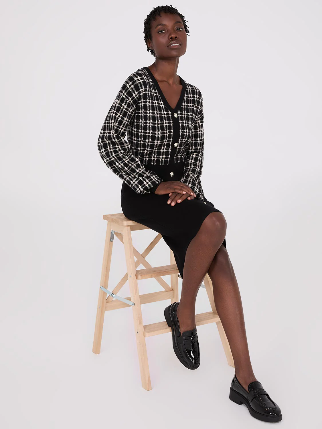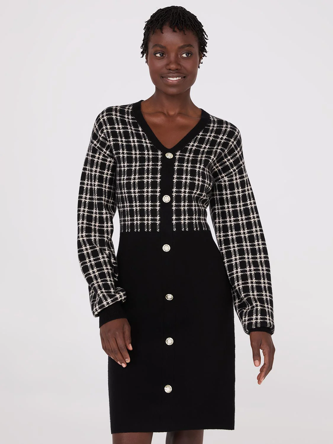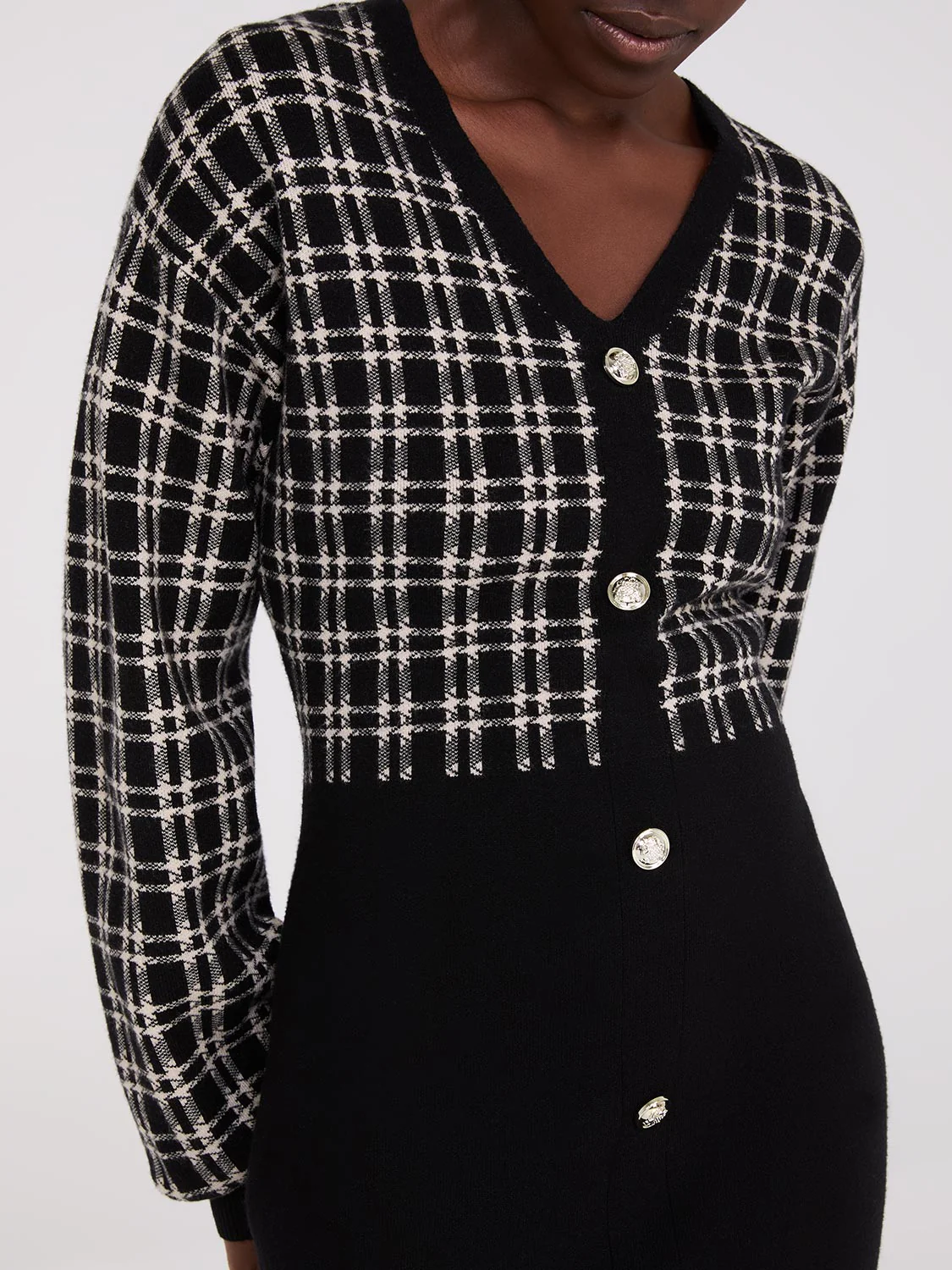 Contrasting hues and a flattering v-neck come together in this soft sweater dress, which can be styled in numerous ways, our favourite being with knee high boots and tights.