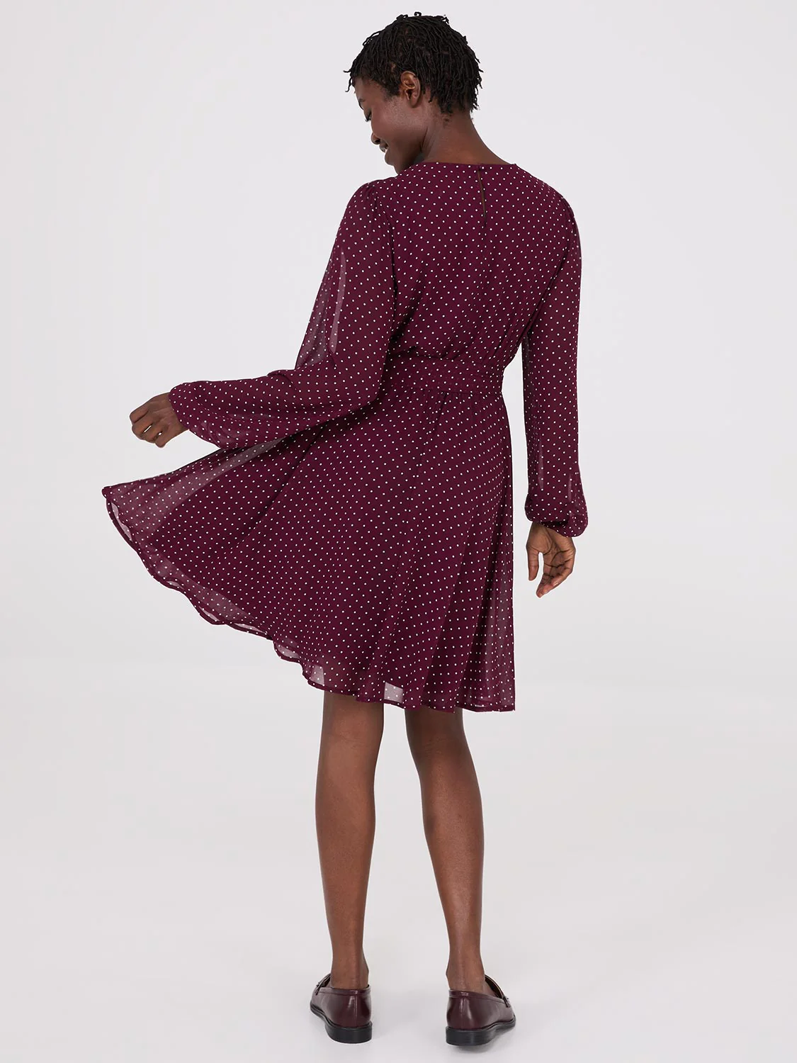 Transition from casual outings to dressed-up occasions with this flattering fit-and-flare dress, adorned with a feminine dot print on chiffon fabric.