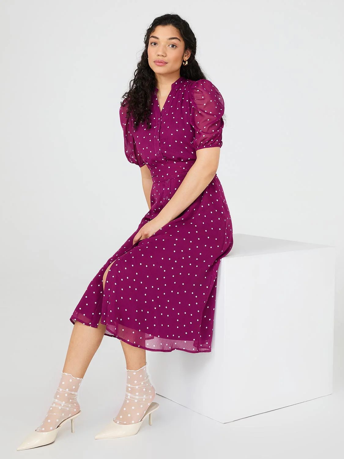 Dot Print Split Neck Dress With Balloon Sleeves