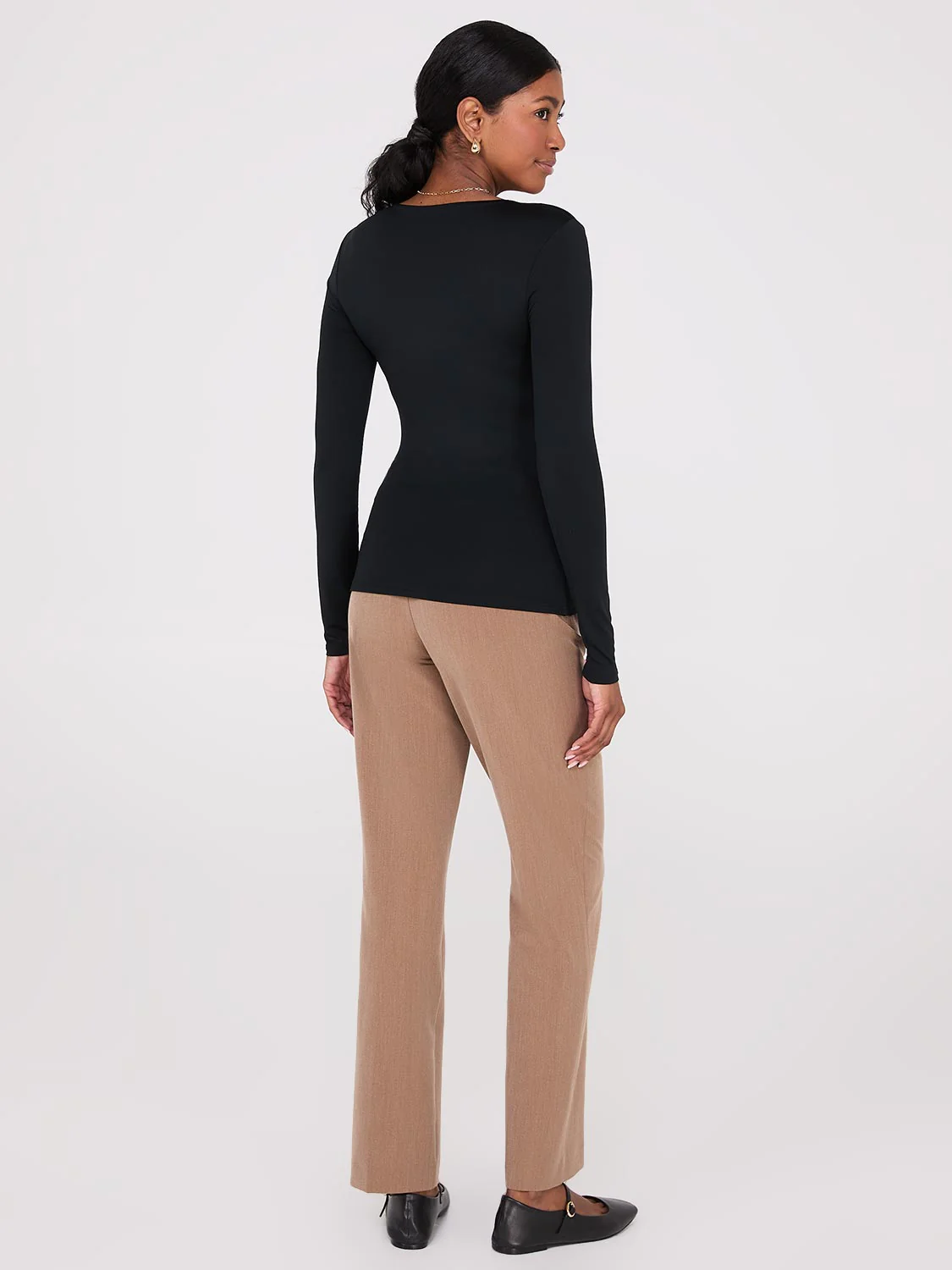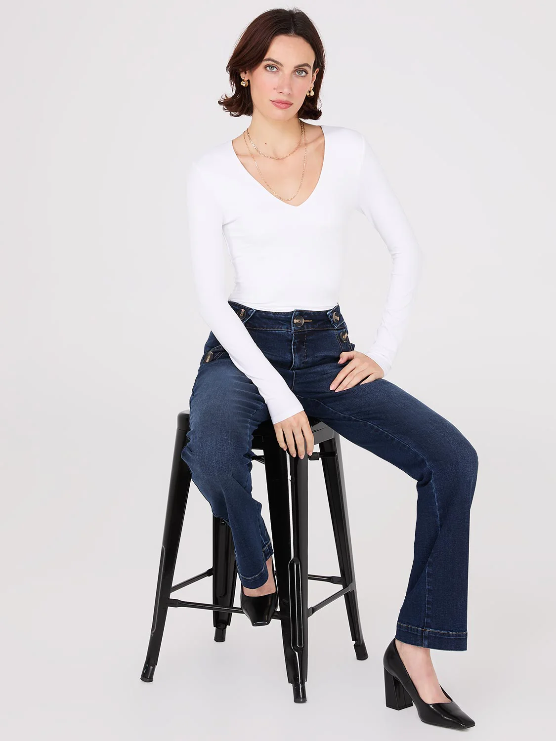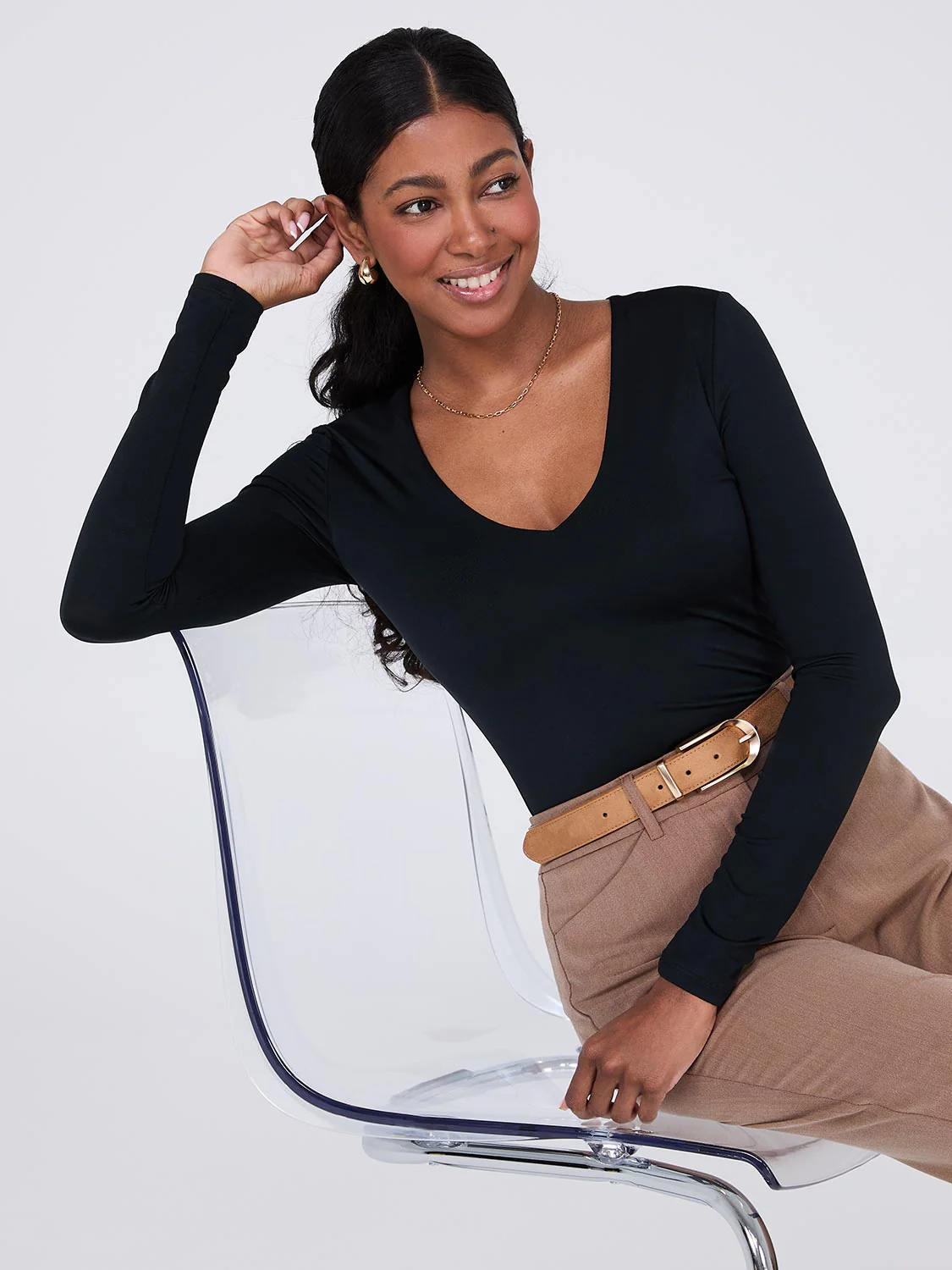 Our double layer v-neck long sleeve top offers the perfect styling option for layering or wearing alone.