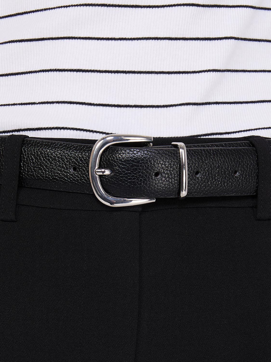 Complete your look with a simple faux leather belt that has a silver buckle for a little shine.