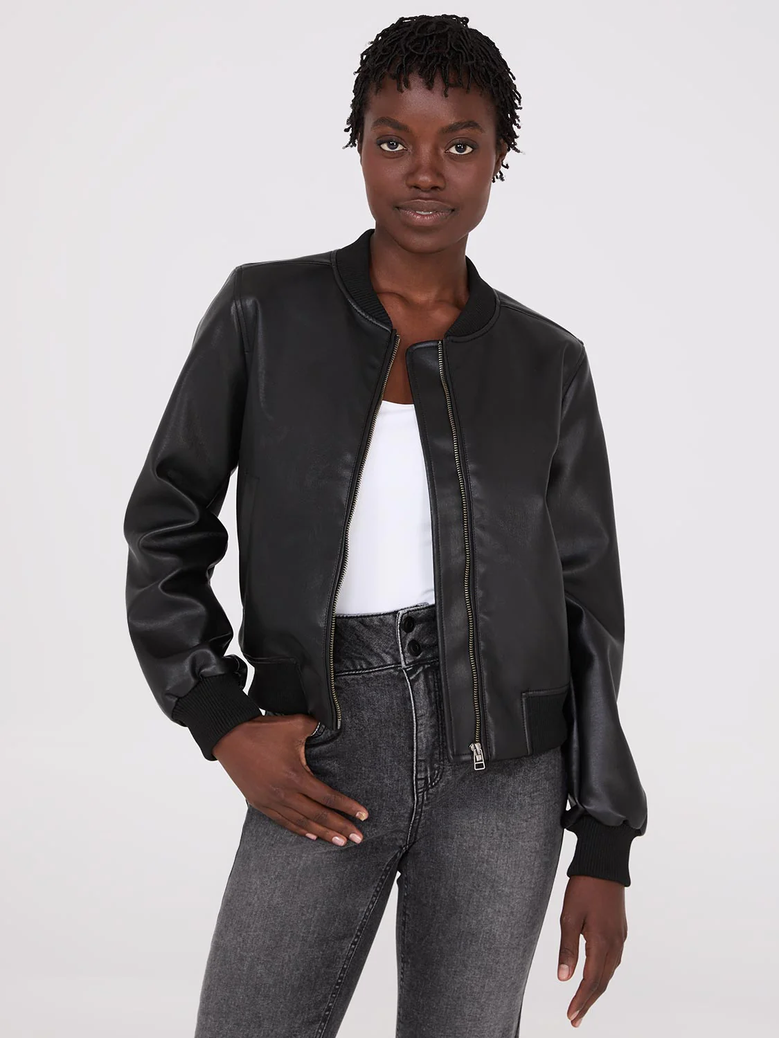 Add an edge to your fall look with this timeless faux leather bomber jacket, an essential piece you’ll rock for years to come.
