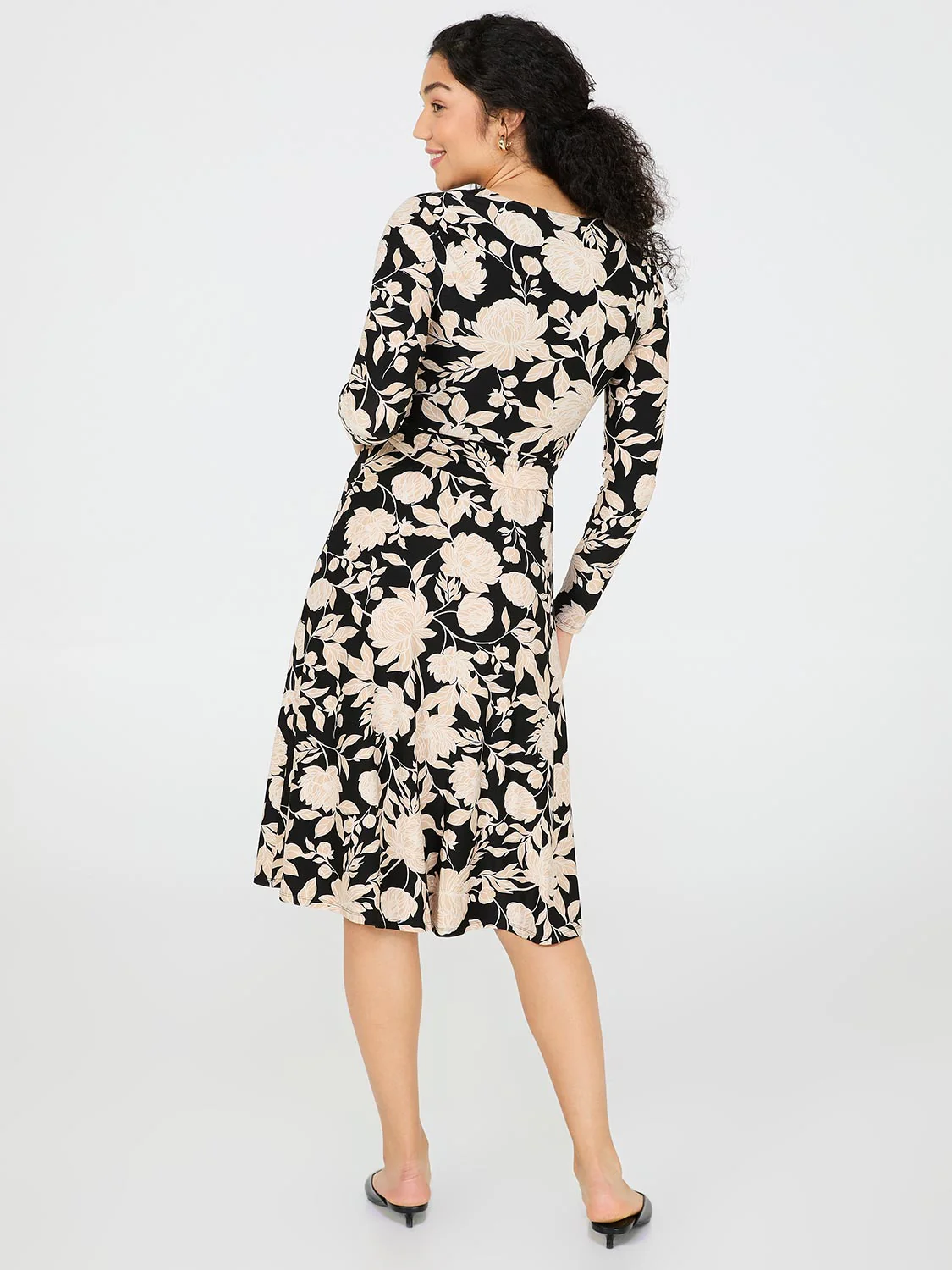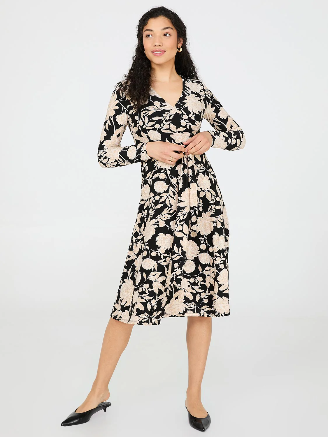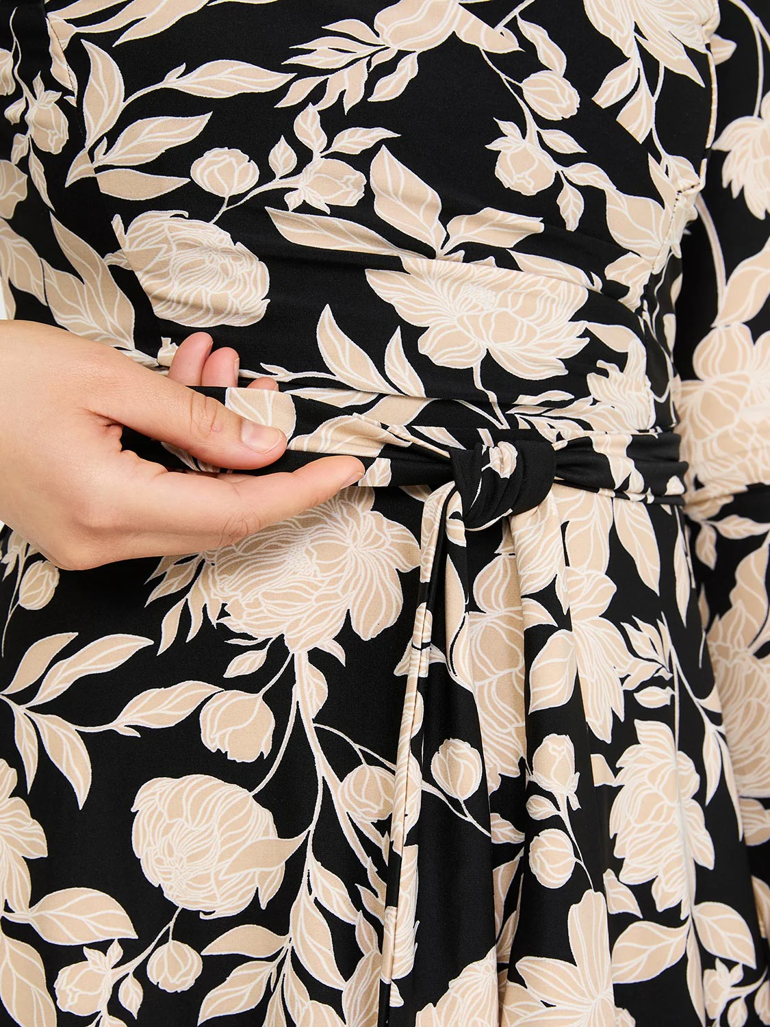 This midi dress showcases a floral print that is sure to make a striking statement wherever you go.