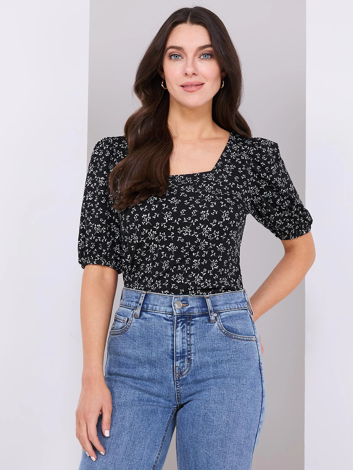 Nothing says flattering like a square neckline, and our floral print top embraces this trend, with puff sleeves adding a stylist twist.