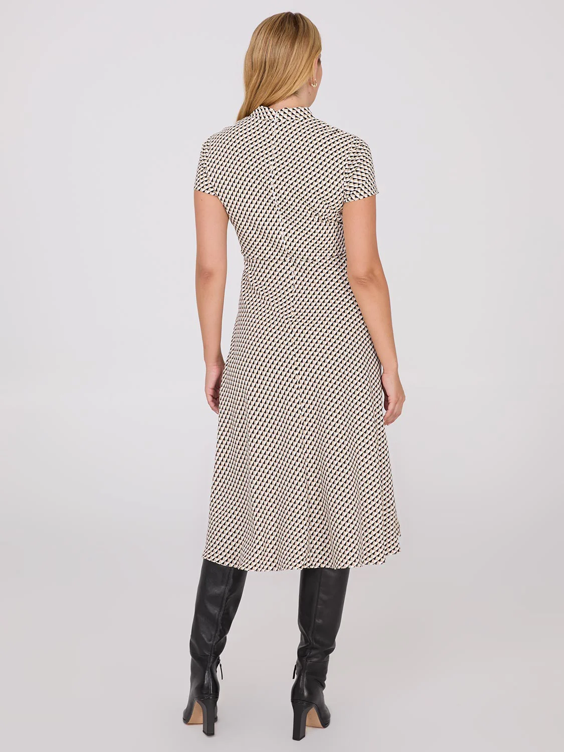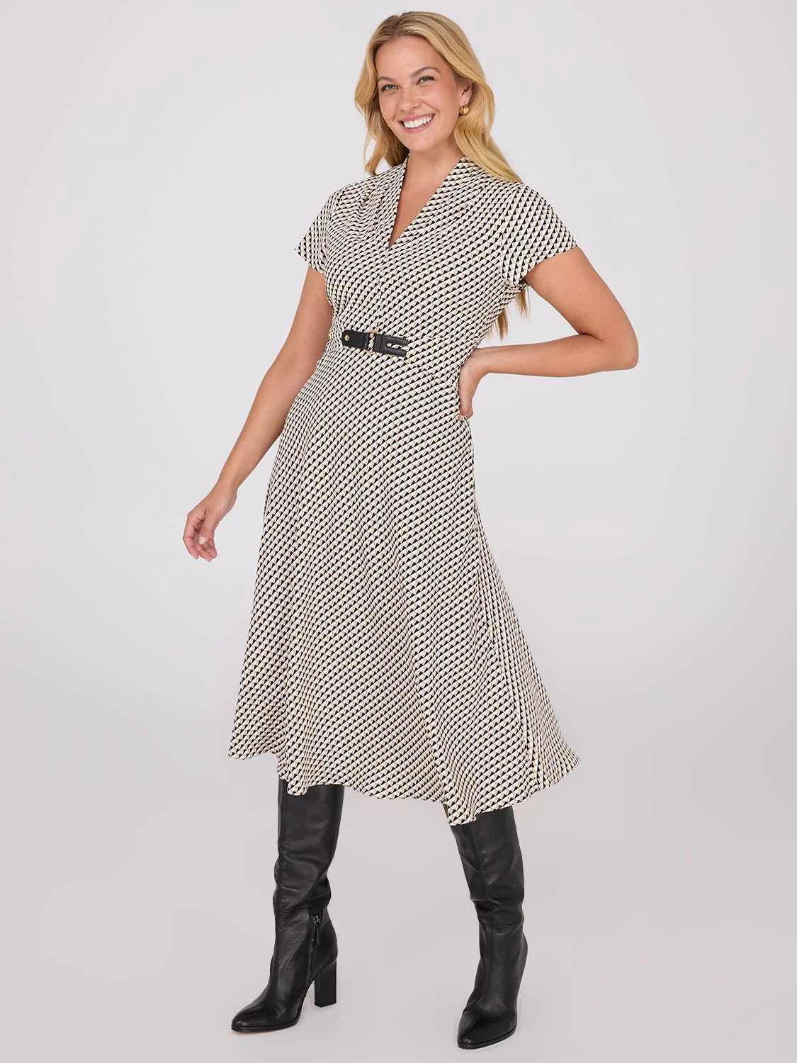 Featuring a bold geometric pattern, a waist-hugging belt, and a chic shawl collar, this dressy one-piece intertwines comfort and timeless style for the perfect dress.