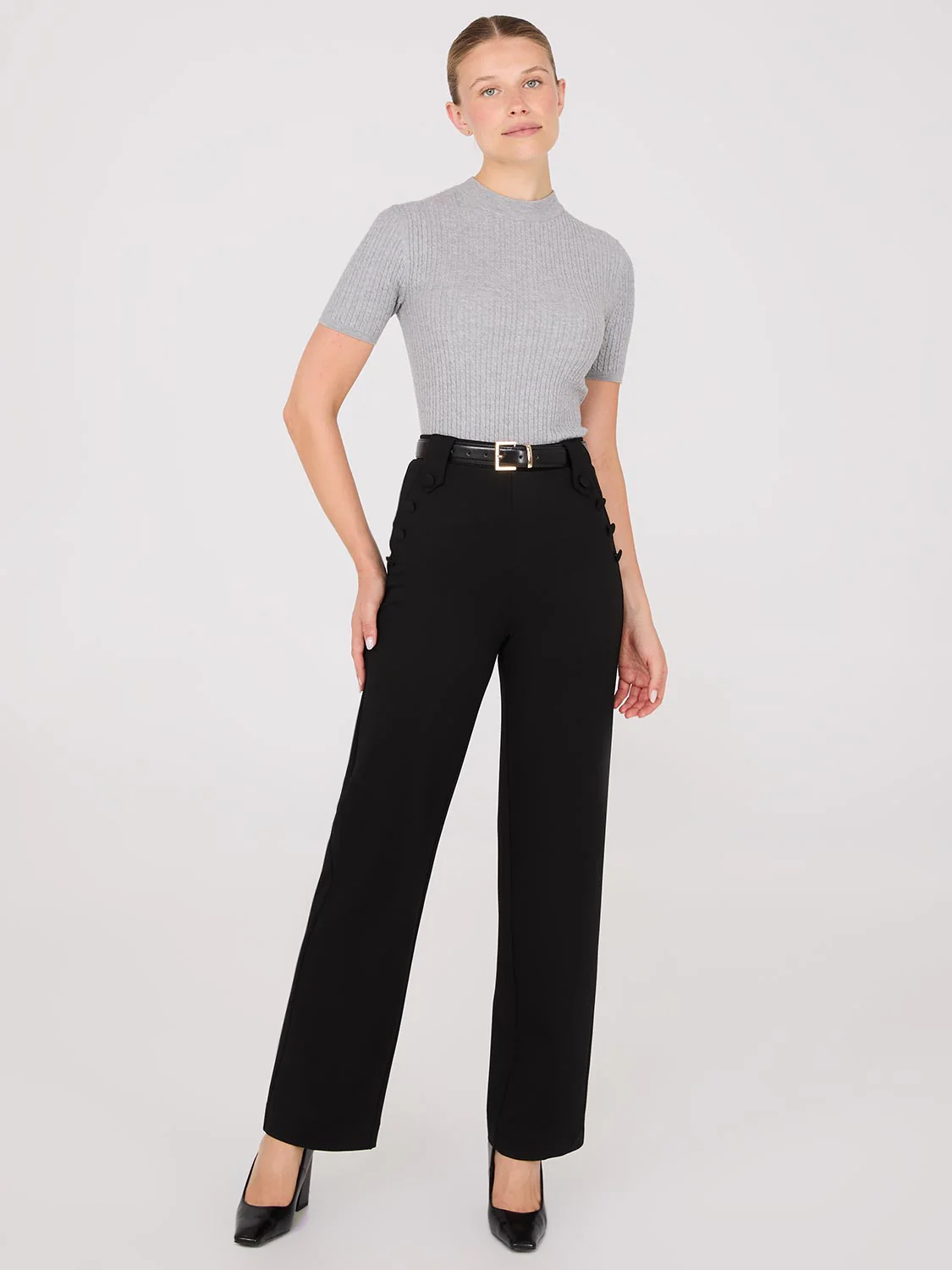 Offering a sophisticated silhouette, these high-rise trousers have stylish button accents for a chic touch.
