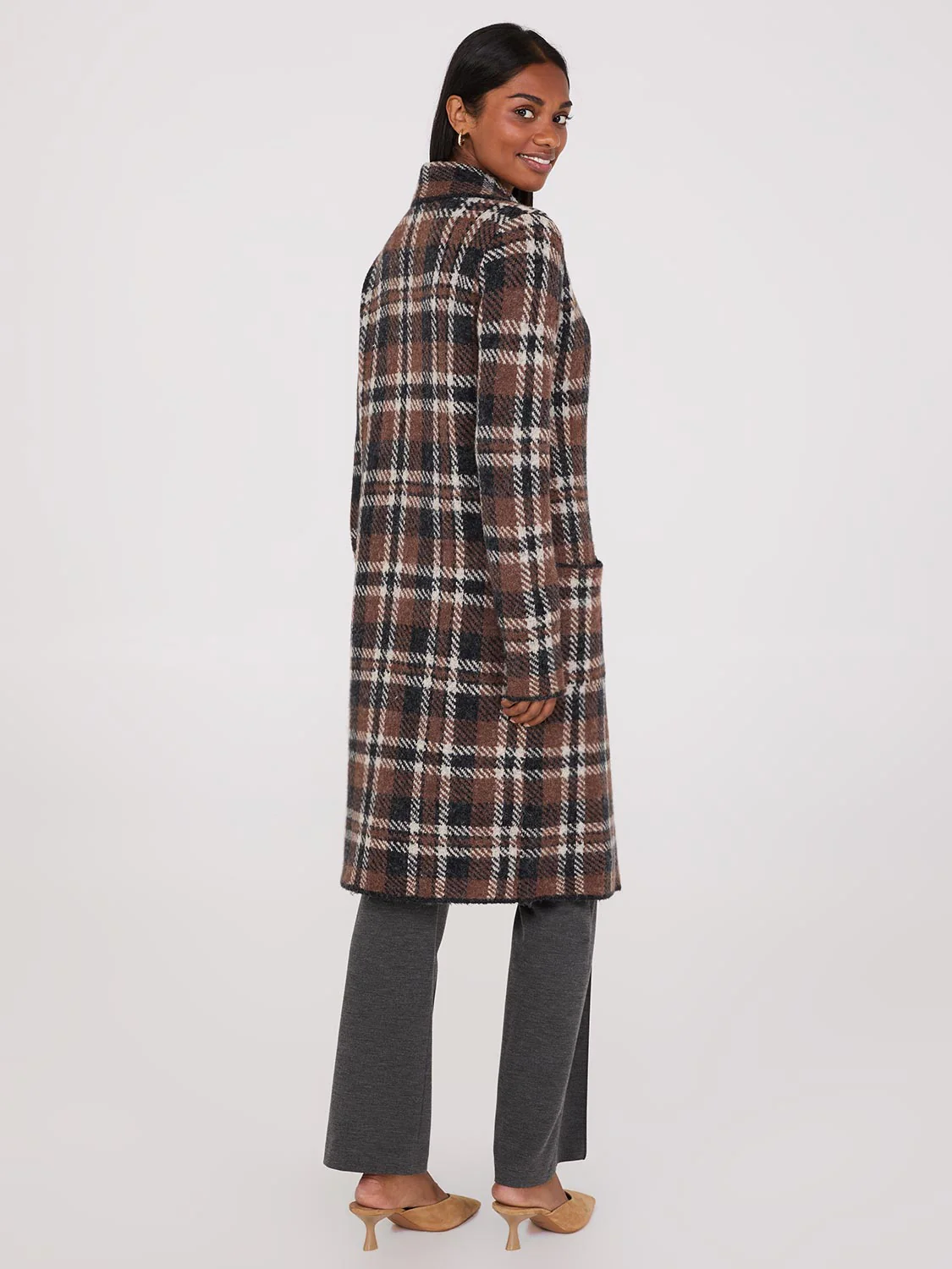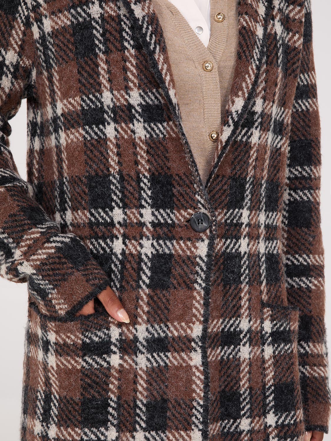 Stay cozy in our sophisticated notch collar and one-button duster, crafted from luxurious jacquard fabric that looks as elegant as it feels.
