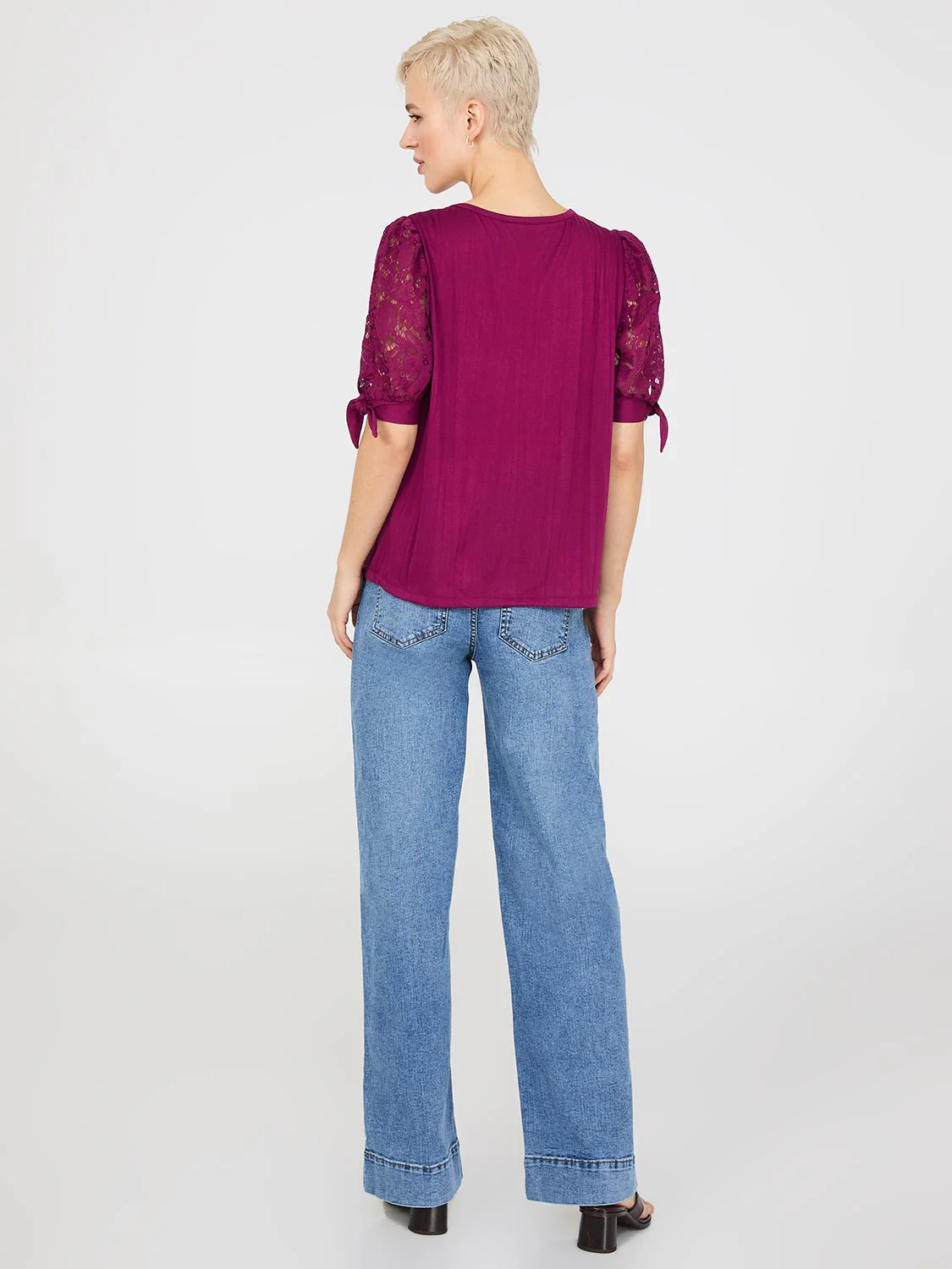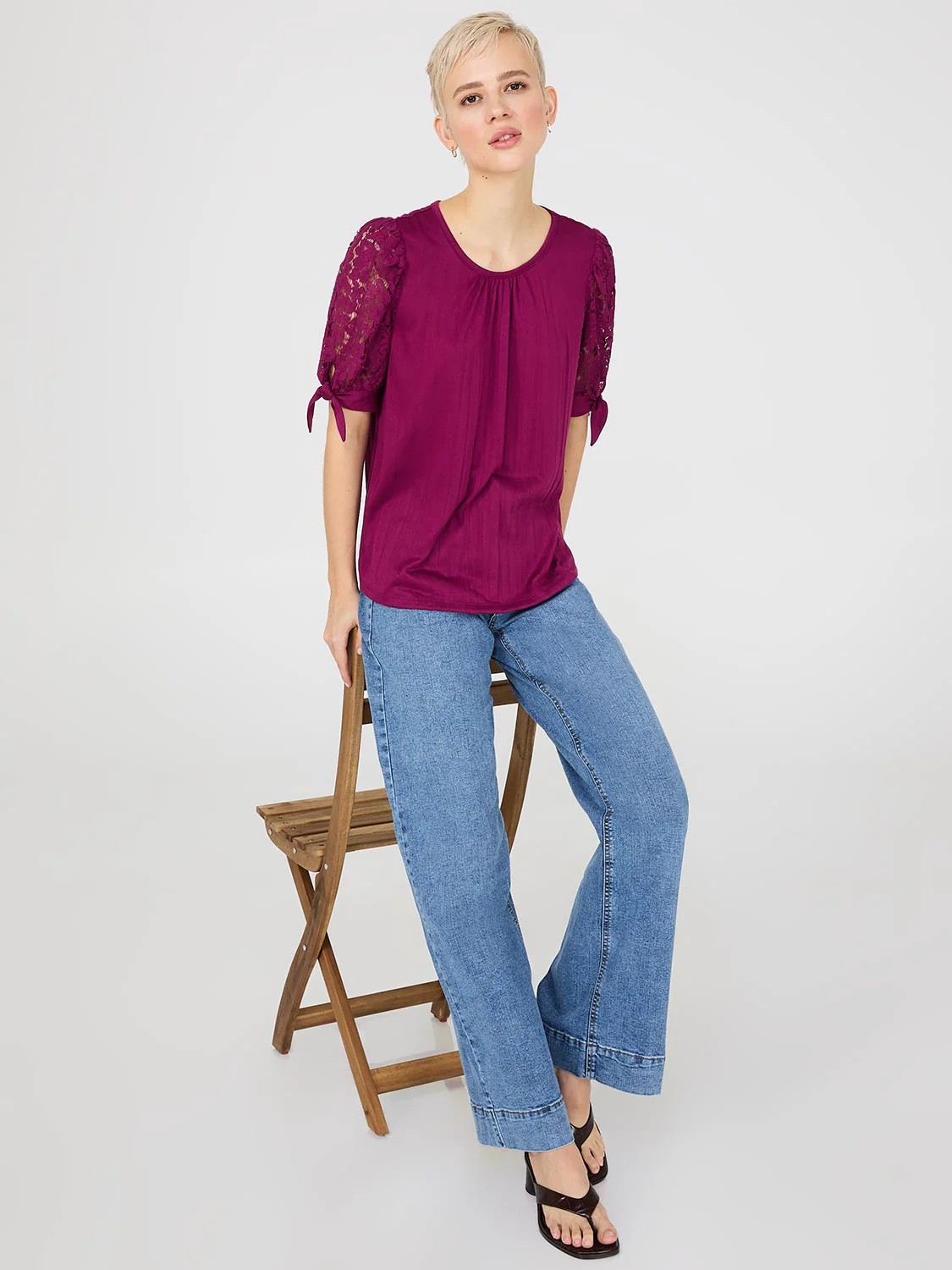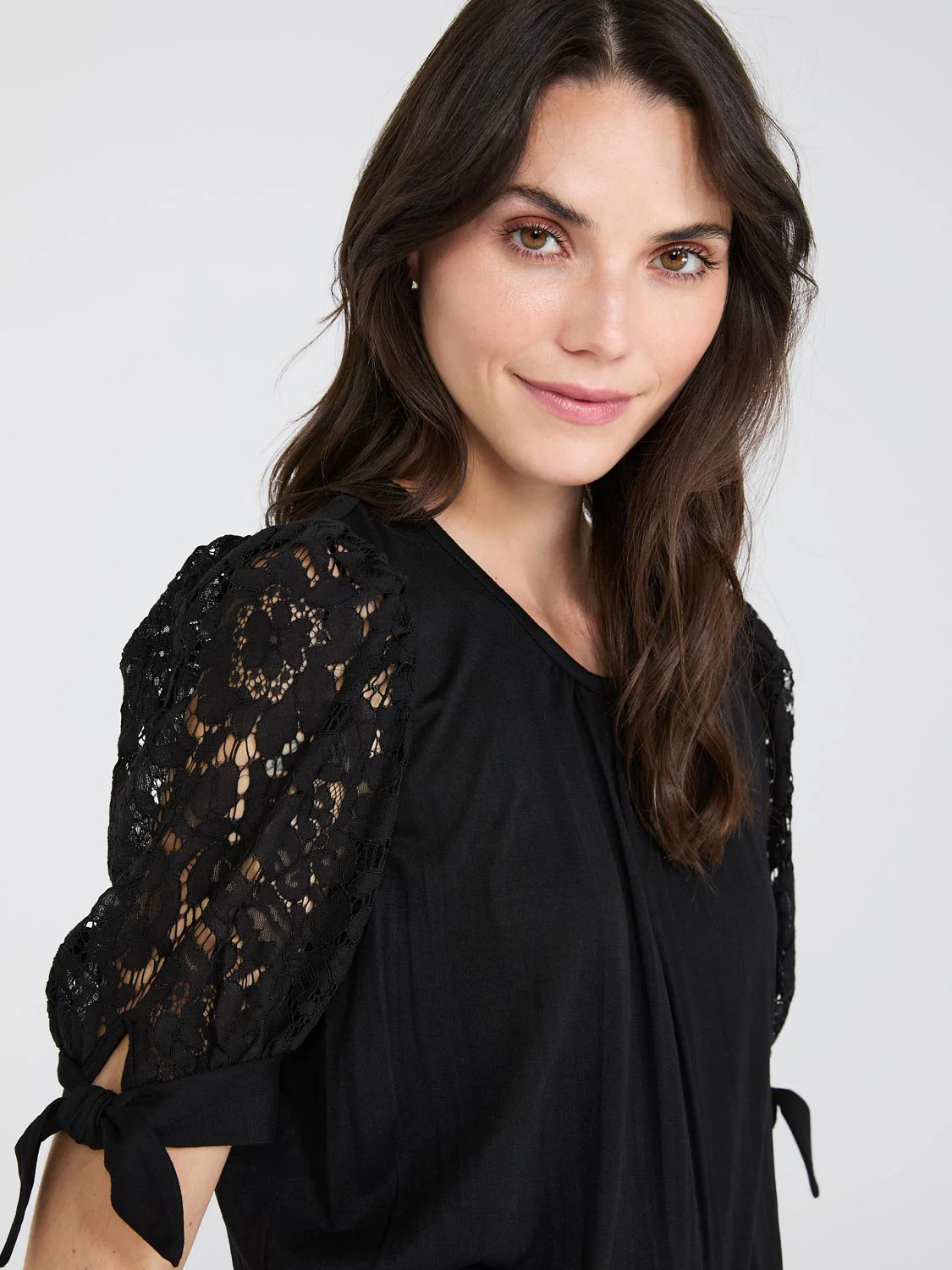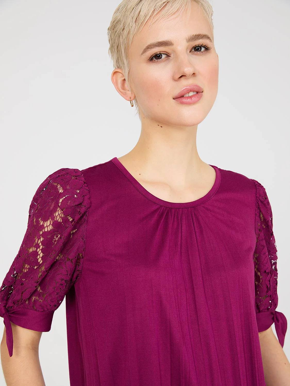 Boast feminine elegance in the office or out to dinner with this lace tie sleeve pleated top.