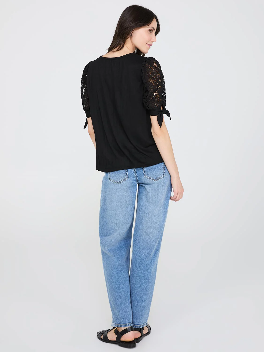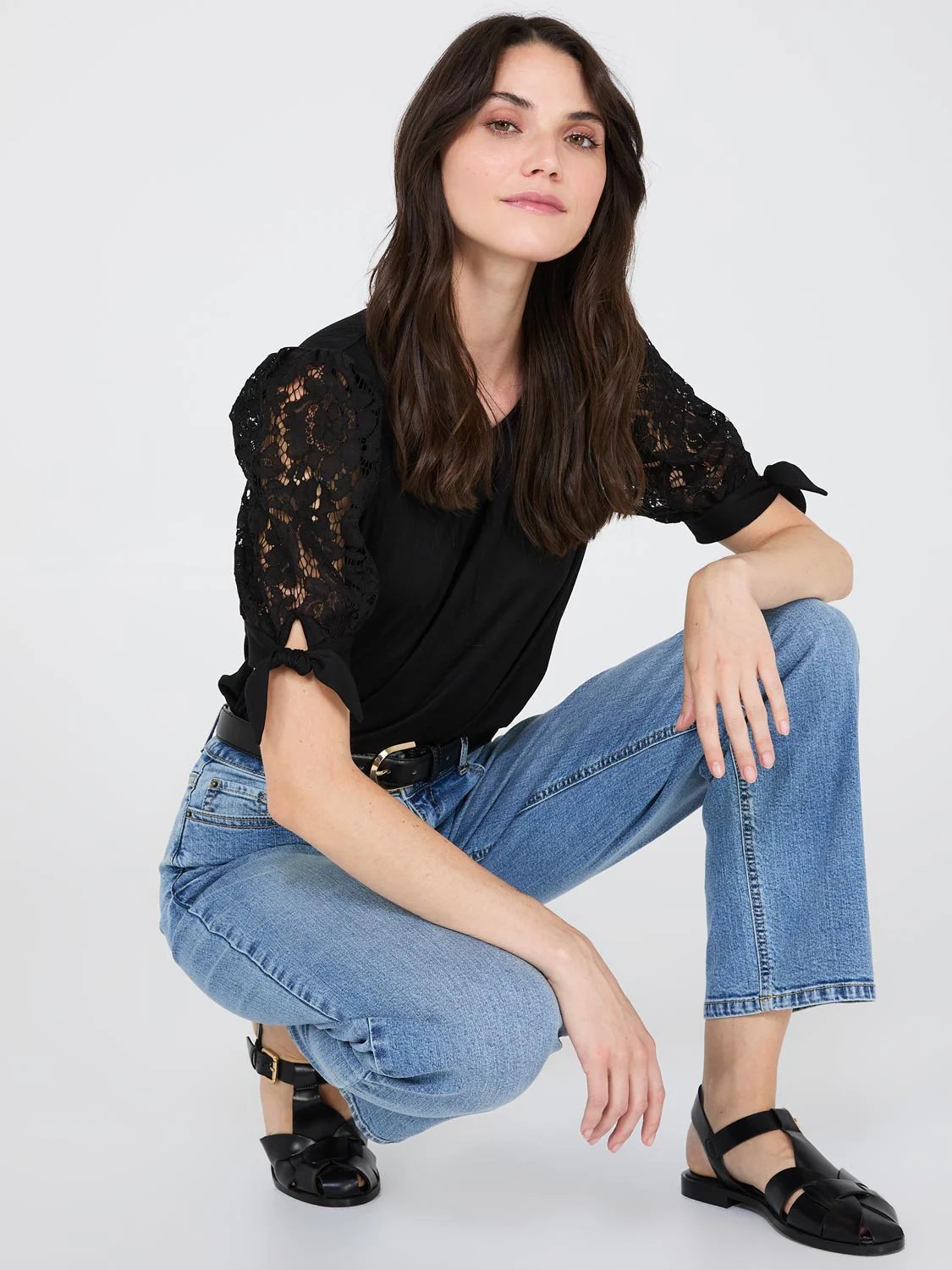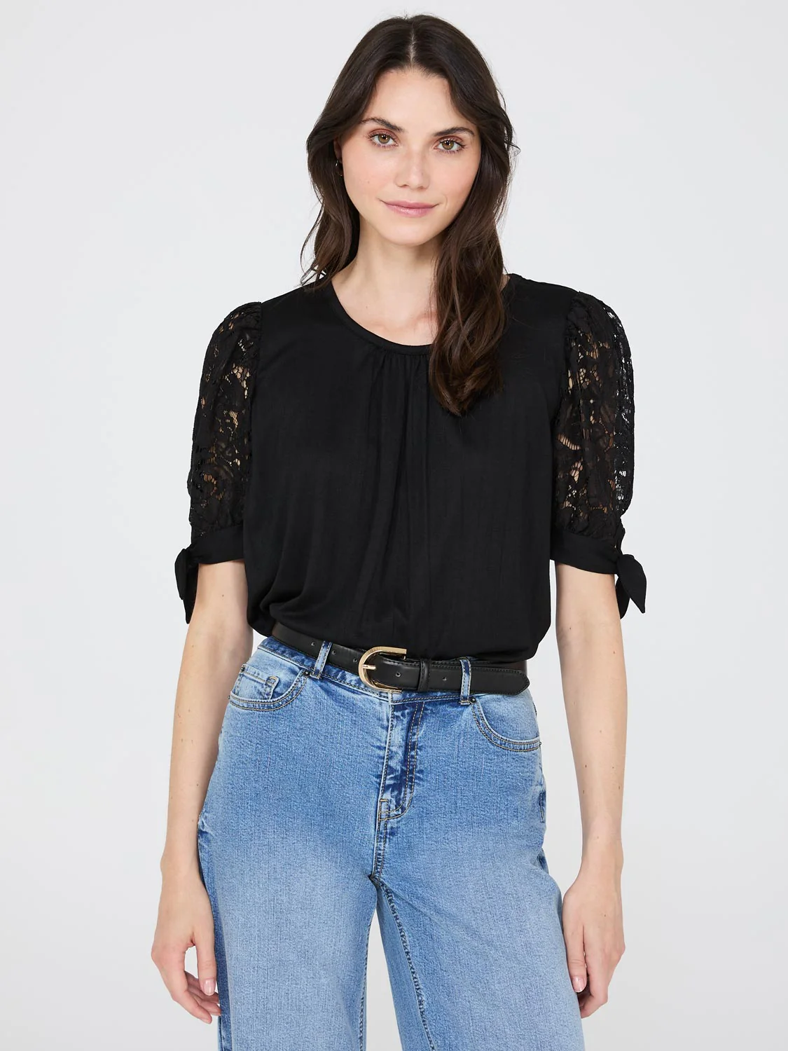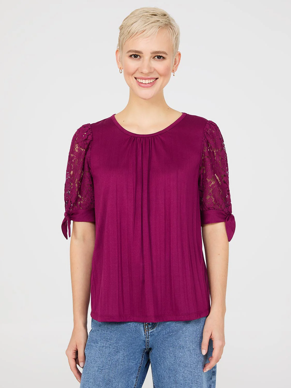 Boast feminine elegance in the office or out to dinner with this lace tie sleeve pleated top.