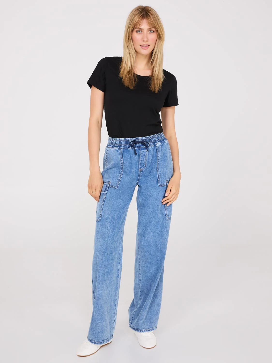 Rock these denim wide-leg cargo pants for a stylishly functional statement piece, ideal for city strolls or weekend adventures.