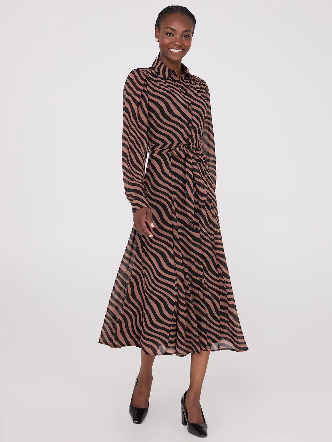 Why choose between a blouse and a dress when you have this maxi shirt dress? Adorned with buttons, a sash at the waist, and a funky print offers a complete and chic look with just one item.