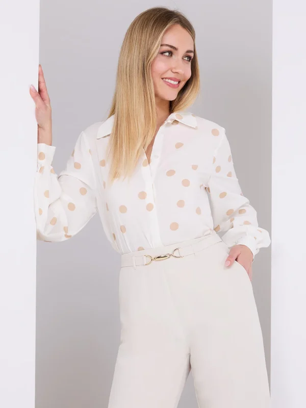 Featuring a sophisticated polka dot pattern on a silky fabric, this button-front blouse melds luxurious comfort with versatile, chic style.