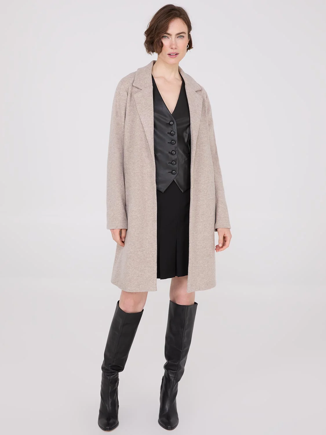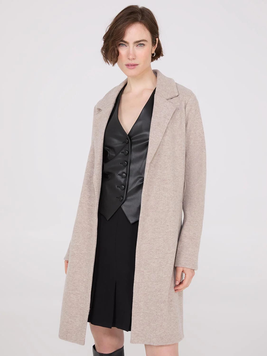 Our cozy, knee-length car coat is made from knit sweater fabric, providing comfort and style for transitional weather.
