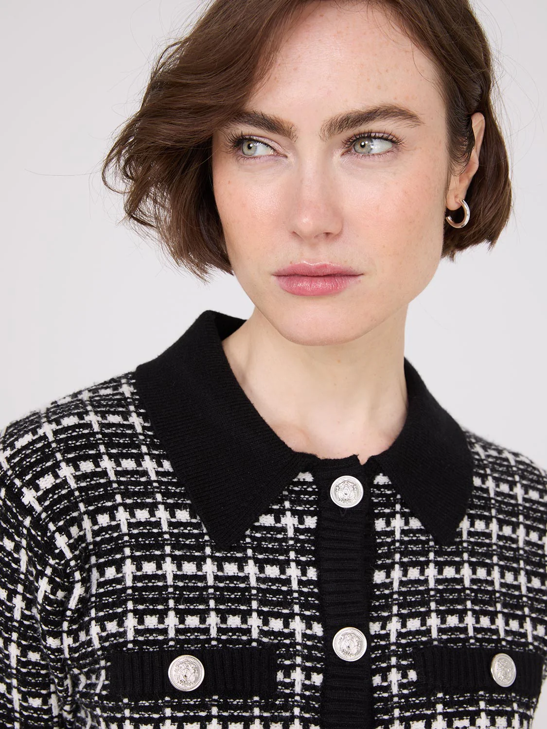 Look preppy chic (think Clueless) in this textured tweed cropped cardigan! It has a tailored waist and a classic button-front closure that pairs dreamily with a pencil skirt or trousers.